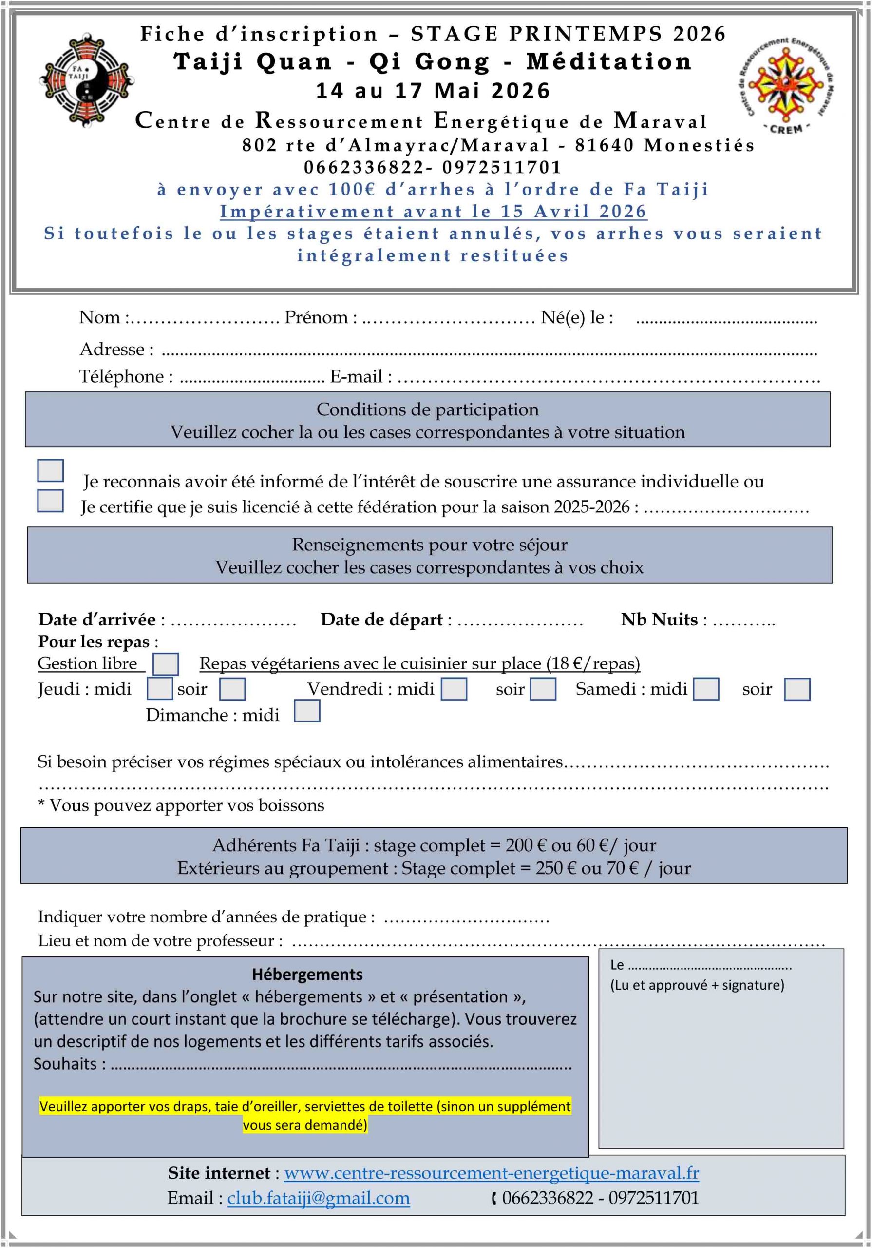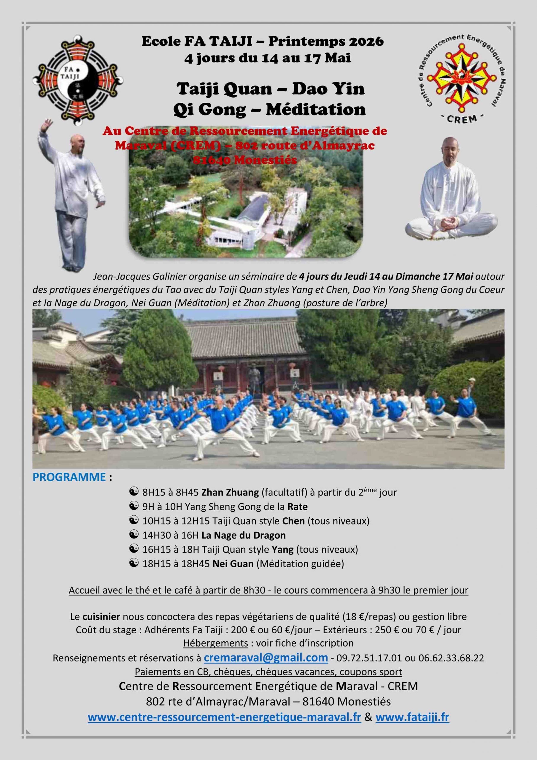 Veuillez vérifier sur notre site www.fataiji.fr et www.centre-ressourcement-energetique-maraval.fr si un stage est annulé, s’il y a besoin de s’incrire en